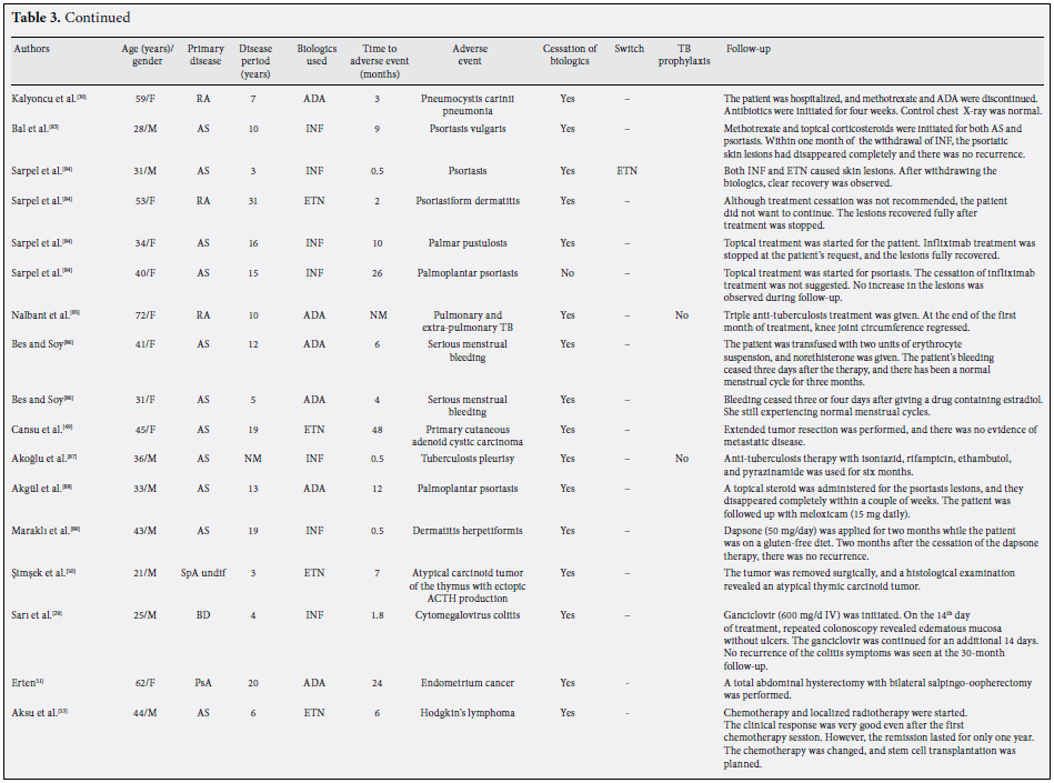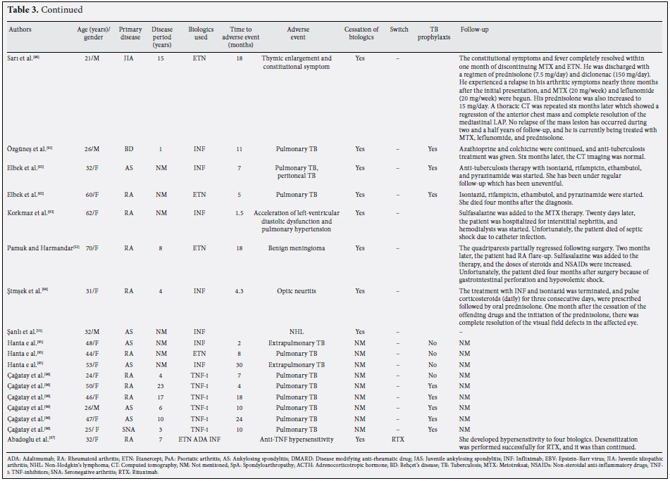 Results: A total of 53 patients (21 males, 32 females) with rheumatic disease who suffered from adverse effects related to the use of biological agents were reported in Turkey in the literature. The mean age was 39.0±15.6 years, while the mean disease duration was 10.6±8.2 years. The mean time from the initiation of the biological agents to the onset of the adverse events was 8.8±9.2 months. The most frequently seen biological agentrelated adverse effects were observed in patients with ankylosing spondylitis (AS) and rheumatoid arthritis (RA). Tuberculosis (TB) was the most commonly reported adverse effect with in 14 patients (26.4%). Other adverse events included psoriasis (15.1%), solid tumors (7.6%), lymphoma (5.7%), drug-induced lupus (3.8%), and menstrual bleeding (3.8%). A total of 77.4% patients who suffered from adverse events discontinued biological therapies.