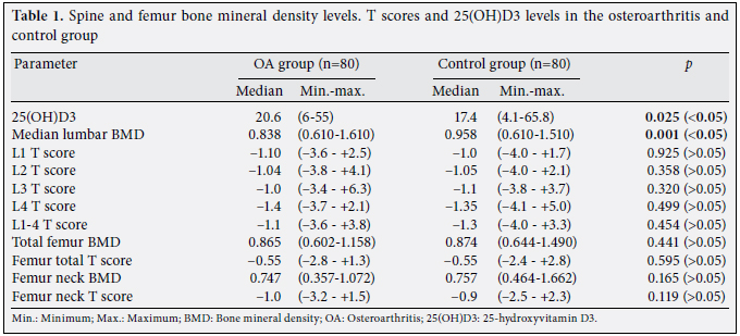 Results: The 25(OH)D3 value of the OA group was significantly higher than the control group, indicating a statistically significant difference. The lumbar spine BMD levels were statistically higher in the control group compared with the OA group, however, there were no significant differences in the hip BMD values and lumbar spine T scores between the groups.