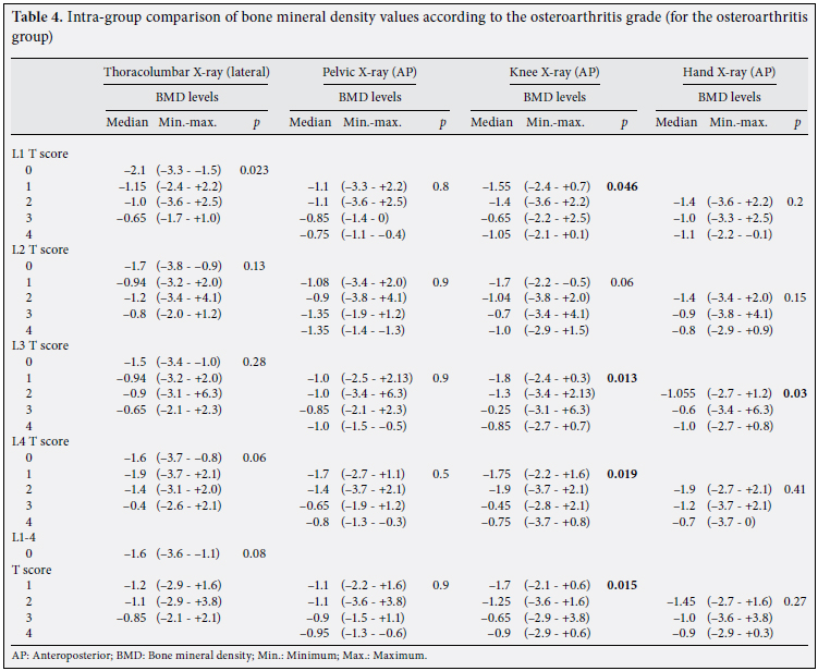 In our study, the AP hand radiographs used to determine the OA grades of the study participants and the BMD values were compared in the OA group. As the hand OA increased in grades II and III, the L3 T score also increased, and the result was statistically significant. However, this finding could be open to argument because there was no such relationship in the other lumbar areas (Table 4).