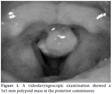 A videolaryngoscopic examination showed a 5x5 mm polypoid mass at the posterior commissure (Figure 1). However, the pyriform fossae, other vocal cord, epiglottis, and valleculla were normal. Computed tomography (CT) of the larynx showed an irregularity at the posterior commissure, but there was no nodal involvement or evidence of metastasis on the thoracic CT.