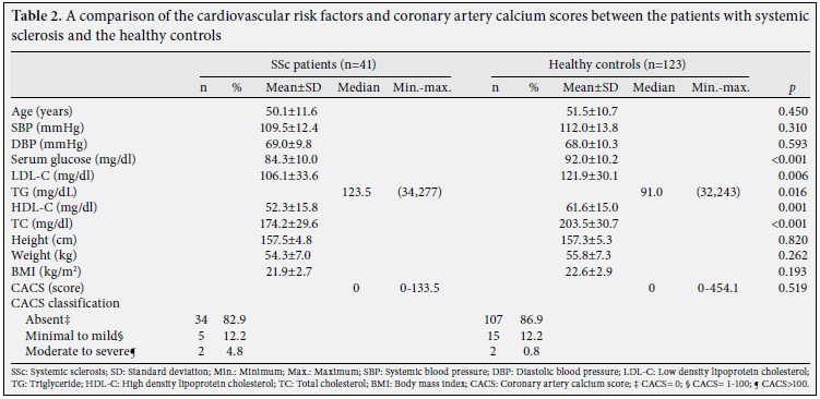 Patients and methods: Between January 2007 and December 2009, 41 female SSc patients and 123 age- and gender-matched healthy subjects who were admitted to a tertiary healthcare center in South Korea were retrospectively analyzed. The CACS were measured using multidetector computed tomography (MDCT) and categorized as either absent (CACS=0), minimalto- mild (CACS=1-100), or moderate-to-severe (CACS≥101). We also collected data from each patient related to conventional cardiovascular risk factors.