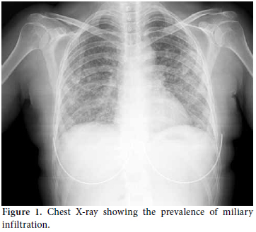 Drainage of the right temporal scalp nodular lesion yielded purulent material and showed Gram-positive bacilli. It later grew nocardial infection, but the specific species was unidentified because our hospital's laboratory could not make that determination. Daily doses of trimethoprim-sulfamethoxazole (TMP-SMX) 15 mg/kg were started. The azathioprine treatment was withdrawn, and the prednisolone dosage was decreased from 40 mg/day to 8 mg/day. In addition, the patient's blood cultures grew beaded, branching Gram-positive rods which were identified as nocardial infection, and high-dose ceftriaxone treatment (4 g/day) was added to the treatment regimen. Five days later, she suddenly developed dyspnea and a cough, and a chest X-ray showed prevalent miliary infiltration (Figure 1). Additionally, urgent thoracic computed tomography (CT) showed miliary nodular infiltration [miliary tuberculosis (TB)-type pattern that appeared to indicate an infection]. Therefore, a bronchoscopy was performed, but Gram staining of the broncoalveolar lavage (BAL) specimen showed no nuclear neutrophils, microorganisms, or acid-fast bacilli.