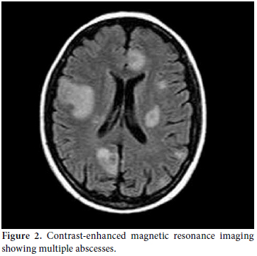 The polymerase chain reaction (PCR) tests for TB and cytomegalovirus (CMV) were negative, and the BAL specimen cultures were negative for bacterial, fungal, and mycobacterial infection. Cranial CT showed hyperdense mass lesions, and contrast-enhanced cranial magnetic resonance imaging (MRI) detected multiple hypodense nodular lesions that were abscess-like (Figure 2) and ring enhancing in the frontal mesencephalon region and cerebella regions. The results for toxoplasma immunoglobulin (Ig) M and IgG were also negative. Based on these findings, the patient's treatment was changed to linezolid and ceftriaxone. One month later, the patient's dyspnea had improved, and the lung infiltration was reduced. The patient was then discharged from the hospital with a prescription for oral TMP-SMX and cefixime treatment; however, a week later, she was readmitted with increased dyspnea and a 38.5 °C fever. On admission, we observed a seizure and left-sided hemiparesthesia; hence, linezolid, ceftriaxone, levetiracetam, and phenytoin were started. Cranial MRI showed a progression of the abscess lesions, especially in the right frontal region (2.5 cm diameter) and midline shift of the ventricle; therefore, urgent surgical decompression of the abscess was performed. A post-surgical examination of the blood cultures was performed at a private laboratory, and it showed Nocardia farcinica (N. farcinica) infection via a sequencing analysis of the 16S rRNA gene of isolates. The N. farcinica antibiogram was resistant to TMPSMX, ampicillin, and imipenem, so metilmicin was added to the patient's treatment. A good outcome was achieved following three months of intravenous treatment as the patient's brain abscess regressed. However, the left hemiparesis persisted.