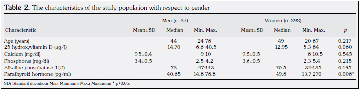 In this study, we analyzed 435 samples (262 winter samples and 173 summer samples). The patients ranged between 20 and 87 years of age (mean 48.72±14.22), and the mean 25-(OH)D status was 16.25±10.98 μ/l. The serum calcium was measured, and the median adjusted calcium was 9.47 mg/dl (range 7.8-10.5 mg/dl). The characteristics of our samples are shown in Table 1.