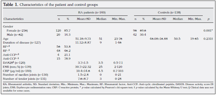 There were no significant differences between the RA patients and controls with respect to age (p=0.231). The mean age of the RA patients was 51.18±9.73 (median 51 years old; range 23-76), whereas it was 46.08±16.88 for the controls (median 50.5 years old; range 19-65). Unfortunately, the laboratory data was not available for some cases, but 127 out of 140 RA patients had disease duration records, and the mean was 11.12±8.87 years (median 9 years; range 1-46). Moreover, 104 of the RA patients had RF records, and 56 (53.8%) had tested positive while 48 (46.2%) were negative. Four (21.1%) of the RA patients were positive for anti-CCP, but 15 (78.9%) tested negative. Furthermore, 120 of the RA patients had a DAS28 value, and the mean was 3.7±1.5 (median DAS28 3.5; range 0.5-7.1). We also found ESR results for 139 of the RA patients, and the mean was 30.7±22.32 (median 25; range 2-120). Additionally, the mean CRP was 10.4±14.46 (median 4.5; range 0.7-103). There were also 130 patients with swollen joints with a mean of 1.5±2.8 (median 0; range 0-21) and 131 had tender joints with a mean of 7.6±8.7 (median 3; range 0-28) (Table 1).