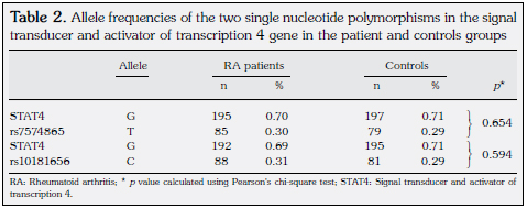 Results: There were no significant differences between the groups regarding the allele frequencies of the rs7574865 and rs10181656 polymorphisms (p=0.654 and p=0.594, respectively) and the genotype distributions of the two polymorphisms (p=0.686 and p=0.467, respectively). There was no correlation between the genotype distributions of the rs7574865 and rs10181656 polymorphisms of the STAT4 gene and the clinical features and laboratory findings of the RA patients.
