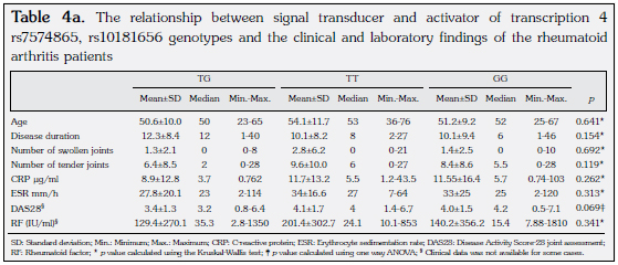 None of the clinical features or disease activity parameters showed any correlation with the rs7574865 and rs10181656 genotype distribution of the STAT4 gene in the RA patients (Table 4a, b).