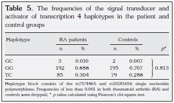 The two SNPs were in complete linkage disequilibrium, which was consistent with the findings in previous studies (D’=1, r2=0.96).10,12-21 The haplotype block consisted of the rs7574865 and rs10181656 SNPs, and frequencies of less than 0.001 in both the RA and controls were dropped. Three (1%) of the RA patients had the GC haplotype, 192 (68.6%) had the GG haplotype, and 85 had (30.4%) the TC haplotype. In addition, two (0.7%) of the healthy controls had the GC haplotype, 195 (70.7%) had the GG haplotype, and 79 (28.6%) had the TC haplotype. However, we found no significant differences between the RA patients and controls (p=0.813) (Table 5).