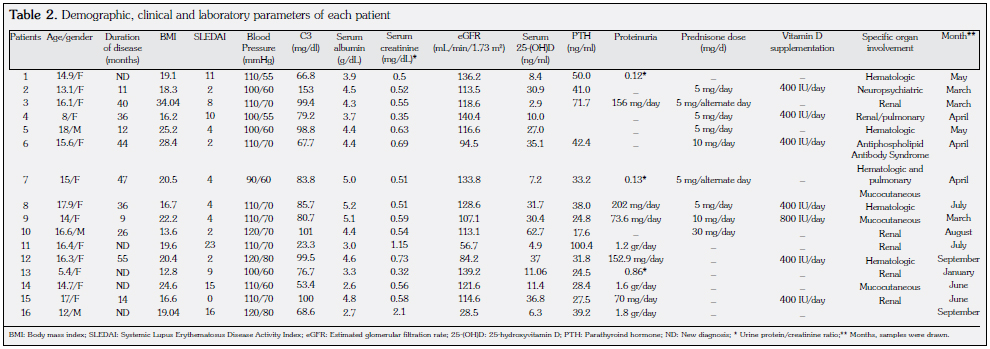 We evaluated the medical records of 16 children (13 girls and 3 boys; mean age 14.47 years; range 5 to 18) with SLE who had an outpatient visit at our clinice between March 2011 and September 2011, and documented the demographic data, disease duration, clinical manifestations, blood pressure, disease activity, serum 25-(OH)D levels along with other laboratory findings, medications used for SLE treatment, and use of vitamin D supplements for these pediatric patients.