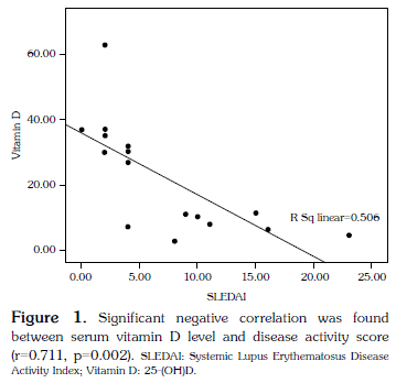 Results: The median follow-up period was 30 (range 9 to 55) months. The mean serum vitamin D level was 22.04±16.75 ng/ml. Vitamin D deficiency (serum vitamin D level of <15 ng/ml) was found in half of the patients. Six of them had significantly lower vitamin D levels (≤10 ng/ml). A significant negative correlation between the serum concentrations of vitamin D and the SLEDAI scores was found (r= -0.711, p=0.002).