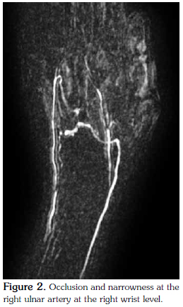 An arterial duplex Doppler ultrasound of the upper extremities showed a bilateral weak monophasic flow in the radial and ulnar arteries, and magnetic resonance angiography (MRA) of the upper extremities revealed that the right ulnar artery was occluded and narrowed at the level of the wrist (Figure 2). However, the left arm vessels and proximal vasculature on the right side were normal.