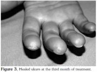 We administered cyclophosphamide 50 mg (three times a day), the sustained release form of nifedipine 30 mg daily, and 150 mg acetylsalicylic acid (ASA) daily, and the necrotic ulcers had healed completely by the third month of this treatment regimen (Figure 3). The oral cyclophosphamide treatment continued for at total of six months, and after that time, the patient had no active complaints. Since significant improvement had occurred, the cyclophosphamide was then discontinued, and the patient went on ASA and nifedipine for prophylaxis.