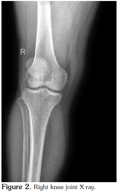 The bilateral knee radiographs of the patient were normal (Figure 2), but those of the feet revealed osteodegenerative changes (Figure 3) and bilateral heel spurs (Figure 4).