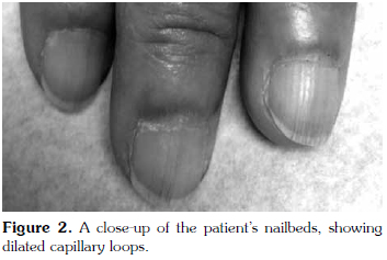 Physical examination was remarkable for puffy, swollen digits (Figure 1) and nail fold changes consisting of dilated capillary loops at the base of the nails bilaterally of all fingers, which were clearly visible to the naked eye (Figure 2). The proximal interphalangeal joints were tender bilaterally with palpable synovitis.