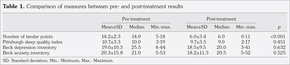 Results: The number of tender points was significantly reduced at the evaluation of post-treatment compared with baseline (p<0.001). However, there were no significant differences between pre- and post-treatment for the scores of the Pittsburgh Sleep Quality Index, the Beck Depression Inventory, and the Beck Anxiety Inventory (all p>0.05).
