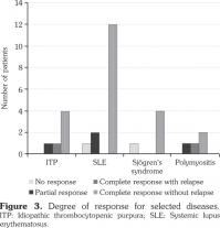 The responsible treating physician identified the patient’s response to rituximab in dermatologic and rheumatologic diseases according to symptoms and signs. Response rate was categorized as: (i) complete response without relapse meaning that the patient attained remission by regression of symptoms and signs without the appearance of other signs and symptoms, (ii) complete response with relapse, (iii) partial response meaning improvement in one or more of the symptoms and signs, and (iv) no response. Improvement in cell counts and remission was documented for ITP and thrombotic thrombocytopenic purpura patients. Patients were evaluated for a follow-up period of two years. Data analysis was performed using the PASW Statistics version 18.0 for Windows software program (SPSS Inc., Chicago, IL, USA). On the other hand, frequencies were extracted using descriptive statistics, while means were compared using the paired sample T test. A P-value less than or equal to