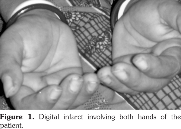 A 33-year-old nondiabetic, nonhypertensive woman presented with a complaint of proximal muscle weakness of all four limbs for the past two months. She also complained of paresthesia in both palms, more on the radial side, which increased with cold exposure and gripping objects in the palm. She had a history of Raynaud’s phenomenon with evidences of digital infarcts (Figure 1), fatigue, malaise, and low-grade fever (37.7-43.3 °C) for two months. The patient had neither a history of trauma to the hands or of upper limb surgery, or hypothyroidism nor statin or corticosteroid or any other drug known to cause myopathy. Her family history was nonspecific.