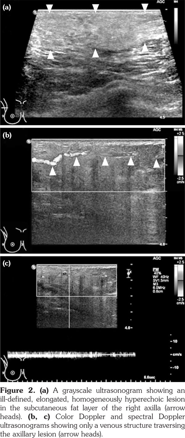 Full-field digital mammography was performed (MAMMOMAT Inspiration; Siemens AG, Munich, Germany). A right mediolateral oblique view revealed an asymmetric density in the right axilla (Figure 1). Ultrasonography was performed with a 5- to 12-MHz linear transducer (iU22; Philips Medical Systems, Bothell, WA, USA), which identified a poorly defined, elongated, homogeneously hyperechoic lesion in the subcutaneous fat layer of the right axilla (Figure 2). The lesion did not exhibit increased vascularity, except for a normal traversing venous structure (Figure 2). The lesion was surgically excised. Pathological examination confirmed the diagnosis as lipogranuloma (Figure 3). On the other hand, complete blood test results were normal.