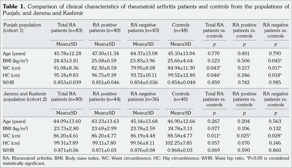 This is a case-control association study of which its design has been approved by the ethics committee of Guru Nanak Dev University. A total of 251 blood samples were collected from two North Indian states, comprising 131 samples (95 females; mean age 46.85±12.52; range 25 to 74 years and 36 males; mean age 42.05±12.64; range 25 to 65 years) from Punjab (cohort 1), and 120 samples (80 females; mean age 44.43±13.58; range 30 to 75 and 40 males; mean age 47.75±12.27; range 28 to 76 years) from Jammu and Kashmir (cohort 2). Samples from Punjab were collected from government and private hospitals including individuals from Amritsar, Gurdaspur, Jallandhar, and Ludhiana regions. Samples collected from hospitals of Jammu had individuals from Jammu as well as Kashmir. Samples from Punjab included 83 patients with RA (40 RA positive and 43 RA negative) and 48 healthy controls. Samples from Jammu and Kashmir constituted 80 patients with RA (44 RA positive and 36 RA negative), and 40 controls without RA. Patients with RA were divided into RA positive and RA negative according to the presence of rheumatoid factor (RF). Inclusion criteria included individuals clinically diagnosed as having RA by expert physicians according to the revised criteria of American College of Rheumatology.(22) Individuals with no history of joint pains were enrolled as healthy controls, and matched for age and ethnicity with patients of RA. After obtaining their informed consent in writing, 3-5 ml venous blood was drawn with sterile syringe, and immediately transferred into a pre-labelled blood collection vial containing anticoagulant (0.5 M EDTA). Other information about each donor such as age, sex and anthropometric measurements comprising of height, weight, waist circumference (WC) and hip circumference (HC) were recorded on donor documentation form for further analysis viz calculating the body mass index and waist hip ratio (WHR).