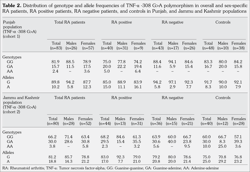 Patients and methods: A total of 251 blood samples were collected comprising 131 samples from Punjab (cohort 1) (40 RA positive and 43 RA negative and 48 healthy controls) and 120 samples from Jammu and Kashmir (cohort 2) (44 RA positive, 36 RA negative and 40 controls). Genotyping was based on amplification refractory mutation system-polymerase chain reaction, followed by agarose gel electrophoresis.