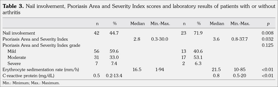 There were 65 patients (51.6%) with nail involvement. While 42 (44.7%) of these patients were in arthritis (-) group, 23 (71.9%) were in arthritis (+) group (p<0.01) (Table 3). Laboratory results revealed that ESR and CRP levels were higher in arthritis (+) group than in arthritis (-) group (both p values <0.01).