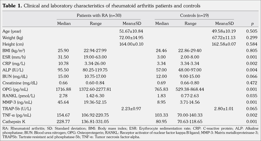 Patients and methods: Thirty patients (9 males, 21 females; mean age, 51.5 years; range 23 to 73 years) with RA and 19 healthy individuals (7 males, 12 females; mean age 51 years; range 24 to 61 years) were included in this study. Patients with RA were subgrouped according to disease activity (active, n=21, mean age 53.0; range 37 to 73 years; inactive, n=9, mean age 46.0; range 23 to 62 years). Levels of receptor activator of nuclear factor kappa B ligand (RANKL), osteoprotegerin (OPG), tartrate-resistant acid phosphatase-5b, tumor necrosis factor-alpha (TNF-α), cathepsin-K, and activity of matrix metalloproteinase-3 (MMP-3) were measured in patient and control groups with enzyme-linked immunosorbent assay method.