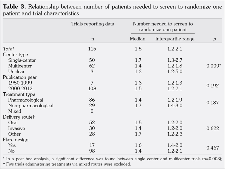 Table 3 shows the relationships between NNS and trial characteristics. While no significance was detected in the publication year, treatment type, delivery route, and flare design, significance was detected for the center type (p=0.009). For example, pharmacological and non-pharmacological trials did not screen patients differently for randomization. In a post hoc analysis for center type, single center trials screened significantly more patients to randomize one patient than multicenter trials (p=0.003).