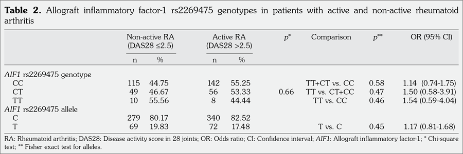 Results: The frequency of TT genotype was significantly higher in RA patients compared with the controls (TT vs. CT+CC: odds ratio=6.22, 95% confidence interval: 1.82-21.28; p=0.0013). The frequency of T allele was 18.55% among RA patients and 12.04% among healthy subjects (odds ratio=1.67, 95% confidence interval=1.25-2.21; p=0.00046). There were no statistically significant differences in distribution of genotypes and alleles between patients with active and non-active disease (DAS28 >2.5 and ≤2.5, respectively).
