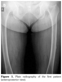 Case 1– A 73-year-old female patient presented with low back, knee, and anterior thigh pain. Pain severity was 8 over 10 point according to visual analog scale. She had difficulty in walking because of pain. She had a history of arthroscopic knee surgery for meniscal pathology in her left knee five years ago. She had chronic low back pain due to L4-5 disc herniation and lumbar spinal stenosis. She had been treated for osteoporosis with alendronate for two years, then with salmon calcitonin for two years and ibandronic acid for a year. Neurological examination was normal. Plain radiographs revealed bilateral lateral cortical thickening in the femur (Figure 1). Magnetic resonance imaging was done to rule out fracture. Bone scintigraphy showed increased uptake in bilateral femoral diaphysis. Routine biochemical tests were normal except increased urinary deoxypyridinoline. Urinary deoxypyridinoline level was 63 nM/mMCre (normal range: 3-7.4 nM/mMCre).