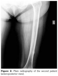 Typical femoral periosteal stress reaction was described as cortical thickening in the lateral side of the subtrochanteric region. In addition, Kwek et al.(5) found bilateral findings of stress reactions or fractures on plain radiographs in 53% of patients on bisphosphonate therapy. In both of our patients, we observed cortical stress reaction bilaterally.