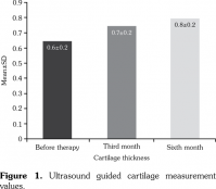 Results: Compared to values before treatment, patients’ visual analog scale values were significantly decreased at third and sixth months after treatment (p<0.001). When compared according to Western Ontario and McMaster Universities Osteoarthritis Index, all values improved significantly after treatment (p<0.001). Results of six-minute walk test improved at third and sixth moths after treatment compared to results before treatment (p<0.05). Cartilage thicknesses increased significantly after treatment at third and sixth months compared to before treatment (p<0.05).
