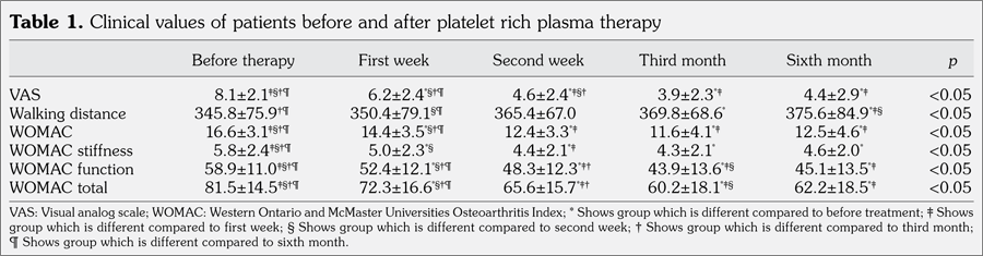 Patients and methods: A total of 82 patients (13 males, 69 females; mean age 63.5±9.3 years; range 40 to 88 years) with chronic knee pain for the last one year, who had grade 3-4 knee osteoarthritis according to Kellgren-Lawrence Scale and visual analog scale value of higher than 5, who did not receive physical therapy for the last six months, and did not respond to treatment despite use of nonsteroidal antiinflammatory drugs and analgesics at least for the last three months were enrolled in the study. Totally 103 knee joints of 82 patients were applied intra-articular platelet rich plasma in the beginning, and first and second weeks of treatment. Platelet rich plasma was applied to both knees in 20 patients. Patients were evaluated clinically with visual analog scale, functionally with Western Ontario and McMaster Universities Osteoarthritis Index, and six-minute walk test before application and after application at first and second weeks, and third and sixth months. Cartilage thicknesses were measured by ultrasound before treatment and at third and sixth months after treatment. Obtained results were compared.