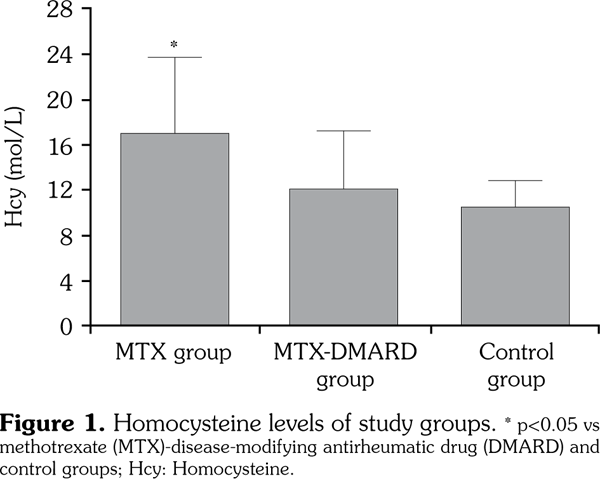 Effects of MTX on Hcy levels in patients with RA are conflicting. Hoekstra et al.(28) demonstrated that plasma levels of Hcy is elevated significantly after application of MTX, and gradually decreased to basal levels until the next application in patients with RA who are using high dose MTX (>25 mg/week). This weekly increase in Hcy levels after MTX treatment was postulated to increase the exposure to Hcy, and caused increased risk of CVD. Moreover, this study proposes that folic acid supplementation in patients with RA is ineffective for preventing against intermittent increases in Hcy. In spite of this study, Morgan et al.(29) found that folic acid supplementation in patients receiving long-term low-dose MTX prevented folic acid deficiency, decreased hyperhomocysteinemia, and might provide a prevention against CVD progression in patients with RA. MTX treatment increases plasma levels of Hcy indirectly in patients with RA, and they must be supplemented with folic acid.(30) Mean doses of 10 mg/week of folic acid may not be enough and must be increased in patients with RA. While Haagsma et al.(31) declared that MTX elevated the Hcy levels, Hernanz et al.(32) have reported against this view. These conflicting reports may be explained by the timings of MTX treatment and obtaining blood samples for analyses. As we know that early folic acid supplementation in 48 hours can decrease the high Hcy levels, it should be rational to evaluate Hcy levels within first 48 hours in patients with RA.