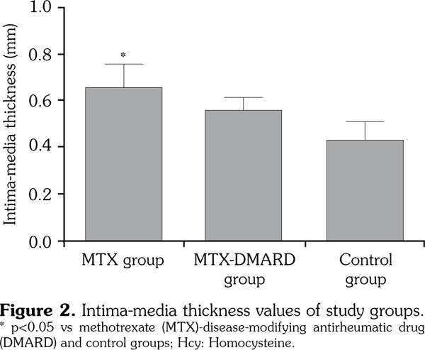 Figures 1 and 2 present the Hcy level and IMT value of the study groups. The Hcy level and IMT value of MTX group were significantly higher than those of the non-MTX-DMARD and control groups (p<0.05). The non-MTX-DMARD and control groups were similar with regard to the Hcy level and IMT value (p>0.05). The Hcy levels and IMT values of non-MTX-DMARD and control groups were comparable (p>0.05).