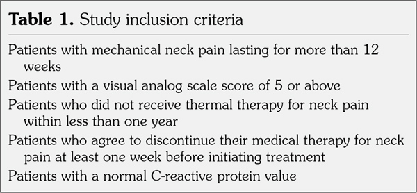 The study population was chosen among patients with chronic neck pain who attended the Outpatient Clinic of Department of Physical Medicine and Rehabilitation of Medical Faculty of Afyon Kocatepe University between August 2007 and July 2008. All patients’ informed signed consent was obtained. The study was approved by our Institutional Research Ethics Committee. A total of 70 patients were enrolled in the study. Patients were randomized either to spa therapy group (7 males, 28 females; mean age 43.08±9.76 years; range 26 to 66 years) or exercise therapy group (5 males, 30 females; 46.45±9.65 years; range 27 to 65 years) by using the table of random numbers. Study inclusion criteria and exclusion criteria are shown in Table 1 and Table 2, respectively.