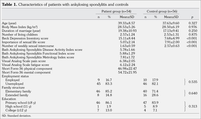 Patients and methods: Fifty-four AS patients (mean age 39.33±8.57 years; range 20 to 55 years) and 56 similar aged healthy controls were included in the study. Depression levels and sexual functions of all participants were evaluated by the Beck Depression Inventory and Female Sexual Function Index (FSFI), respectively. Other assessment methods included the visual analog scale for pain, fatigue, and importance of sexual life; Bath Ankylosing Spondylitis Disease Activity Index for disease activity, Bath Ankylosing Spondylitis Functional Index for functionality, Bath Ankylosing Spondylitis Metrology Index for spinal mobility, and Short Form-36 (SF-36) for quality of life.