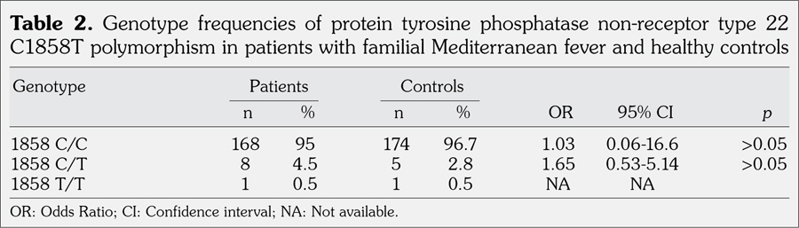 Patients and methods: We conducted a case-control study with 180 FMF patients (68 males, 112 females; mean age 38.2±1.6 years; range 16 to 81 years) and 184 healthy controls (86 males, 98 females; mean age 32.9±9.2 years; range 18 to 58 years). The PTPN22 C1858T polymorphism (rs2476601) was genotyped by polymerase chain reaction restriction fragment length polymorphism. In patients with FMF, clinical features, disease severity score, the frequencies of amyloidosis, positive family history, and Mediterranean fever gene mutations were determined.