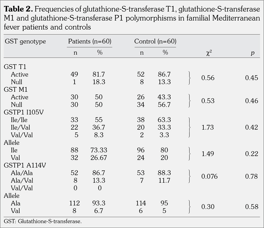 Subjects in the FMF and control groups were evaluated in terms of the GSTT1, GSTM1 and GSTP1 I105V, and A114V gene polymorphisms. In the FMF and control groups, GSTT1 null allele frequencies were 18.3% (n=11) and 13.3% (n=8), respectively. GSTM1 null allele frequencies in the patients and controls were detected as 50% (n=30) and 56.7% (n=34), respectively. The difference between two groups was not statistically significant in terms of GSTT1 and GSTM1 gene polymorphisms (p>0.05). GSTP1 Ile105Val polymorphism frequencies were 55% (n=33), 36.7% (n=22), and 8.3% (n=5) for Ile/Ile wild type, Ile/Val heterozygous, and Val/Val mutant homozygous in FMF patients, respectively. Frequencies of Ile/Ile, Ile/Val, and Val/Val genotypes were 63.3% (n=38), 33.3% (n=20), and 3.3% (n=2) in controls, respectively. No homozygous mutant genotype was detected for Ala114Val polymorphism. Ala/Val heterozygous genotype was detected in eight of FMF patients and seven of control subjects. Distribution of allele frequencies of two GSTP1 polymorphisms was also not statistically significant (Table 2).