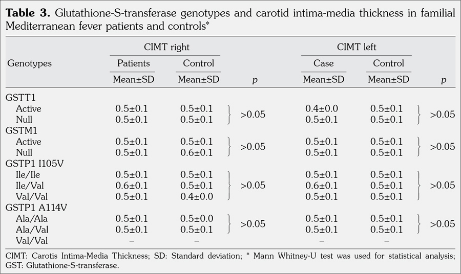 Conclusion: Although no significant association was observed between GST polymorphisms and CIMT in FMF patients and controls, CIMT was statistically significantly higher in FMF patients compared to controls.