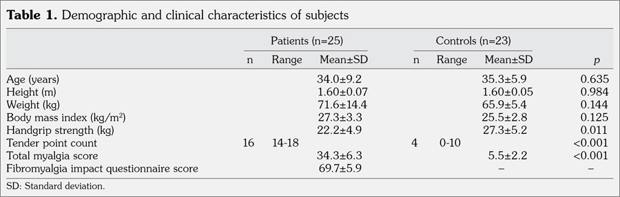 Patients and methods: Twenty-five female patients (mean age 34±9.2 years; range 20 to 50 years) with FM and 23 age- and body mass index-similar healthy females (mean age 35.3±9.2 years; range 26 to 46) were included. Demographic characteristics of the subjects were recorded. Tender point count was noted in the patient group. Also; total myalgia score and fibromyalgia impact questionnaire scores were calculated. Handgrip strength was measured with Jamar® dynamometer. Patients who had fibromyalgia impact questionnaire scores ≥70 out of 100 were considered to have severe FM, while those who had scores <70 were considered to have moderate FM.