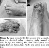 including 1/2 distal of the metatarsal bone. There was an open wound with skin necrosis with a greyish, large and ulcerated nodule containing chalky material. Besides, widespread tophi on extremities and soft tissues were noticed (Figure 1). Many joints including the nonfunctional first IPJ of right toe were deformed.