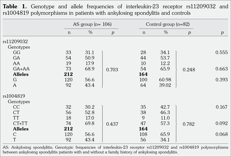 HLA-B27 positive dizygotic twins, indicating that there is a substantial non-major histocompatibility complex (MHC) genetic component underlying the disease.(4) The interleukin-23 receptor (IL-23R) gene, which is located on chromosome 1p31, is considered to have a role in molecular basis of AS pathogenesis.(6) IL-23 gene, a member of the hematopoietin receptor family, is formed by two cytokine receptor domains and encodes IL-23R.(7) IL-23R and its ligand IL-23 are key components of the immunoregulatory pathway. Recent studies have shown that some single nucleotide polymorphisms (SNPs) of the IL-23R gene are strongly associated with several autoimmune diseases, such as Crohn’s disease, AS, and Behçet’s disease.(8) Because of the similarities between AS and these diseases in clinical and immunological aspects, near-term scientific studies focused on the relationship between gene polymorphisms of IL-23 and AS. Burton et al.(9) genotyped 14,436 SNP in AS patients and reported presence of an association between IL-23R polymorphisms and AS. Among these SNPs, rs11209032 is localized at intergenic region and does not encode an amino acid. Besides, this SNP is thought to be associated with the shearing of messenger ribonucleic acid or have a function in the interaction of IL-23R and its adjacent gene IL-12RB2 by an unknown mechanism.(10) Qian et al.(11) reported that the rs1004819 SNP is localized in intron and may exert its influence by regulating differential splicing of IL-23R messenger ribonucleic acid. Both polymorphisms may affect the splicing process of IL-23R messenger ribonucleic acid which may explain the relationship between these SNPs and AS. To our knowledge, the IL-23R gene polymorphism has not been studied in Turkish AS cohort yet.