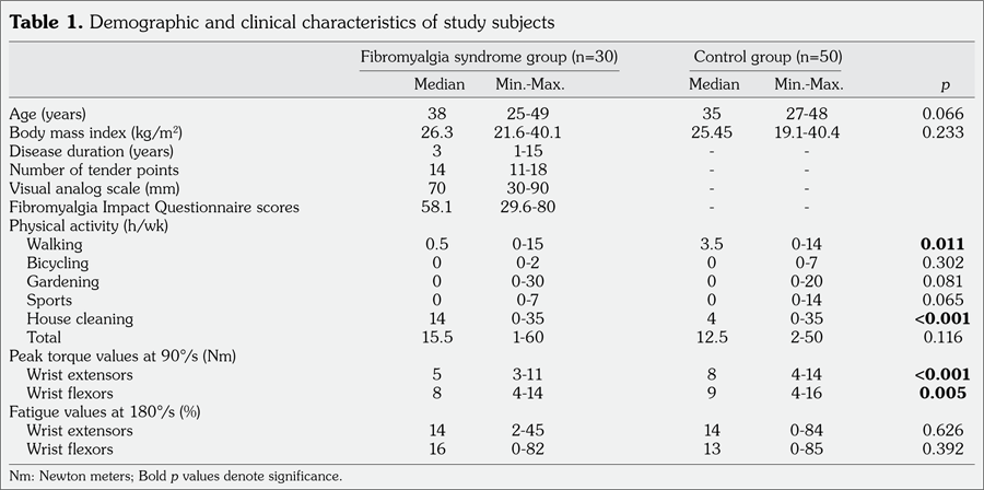 Patients and methods: Thirty consecutive female FMS patients (mean age 39.8±6.7 years; range 25 to 49 years) and 50 age and body mass index similar healthy females (mean age 35.4±7.9 years; range 27 to 48 years) were enrolled. Patients’ clinical characteristics were recorded and symptoms were evaluated by the Fibromyalgia Impact Questionnaire. In addition to the demographic characteristics, physical activities of all subjects were questioned, isokinetic muscle performance was measured, and fatigue index was calculated by endurance test.