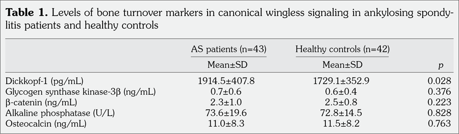 Results: No significant difference was observed between AS patients and healthy controls for the levels of glycogen synthase kinase-3β, β-catenin, alkaline phosphatase, and osteocalcin, respectively (p>0.05). The level of Dickkopf-1 was significantly higher in AS patients (1914.5±407.8 pg/mL) than in healthy controls (1729.1±352.9 pg/mL) (p<0.05). There was no correlation between high Dickkopf-1 level and any of the clinical parameters contributing to inflammation or bone formation. However, the correlation between osteocalcin and disease duration was significant in AS patients (r=0.323, p=0.034).