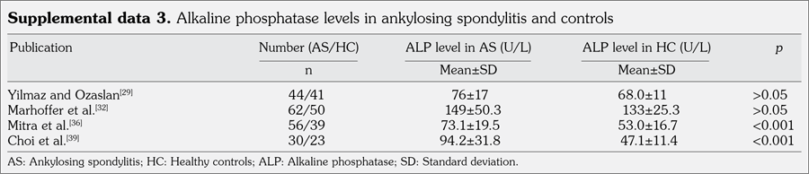 - Sheehan NJ, Slavin BM, Kind PR, Mathews JA. Increased serum alkaline phosphatase activity in ankylosing spondylitis. Ann Rheum Dis 1983;42:563-5.