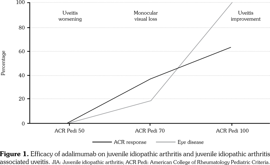 Results: Of the JIA patients, three (27.27%) had oligoarticular/extended oligoarticular JIA and eight (72.73%) had enthesitis-related arthritis. Anti-nuclear antibody positivity was present in 27.27% (all females) while human leukocyte antigen-B51 was determined in 62.5% and human leukocyte antigen-B27 in 12.5% of patients. Mean uveitis duration before adalimumab introduction was 12.3 months. After two years of follow-up, there were no relapses of uveitis and visual acuity was stable while on adalimumab and methotrexate treatment. All patient were gradually tapered and discontinued treatment with topical steroids. Disease activity improved and seven patients (63.64%) achieved American College of Rheumatology 100% response rate (attained remission), while four patients (36.36%) achieved American College of Rheumatology 70% response rate.