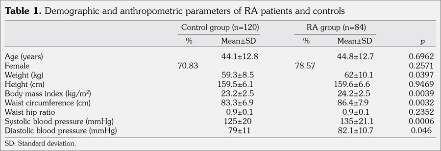 Baseline characteristics of both patient and control groups are shown in Table 1. Smoking, alcohol, and postmenopausal statuses in females were similar in both groups. Mean waist circumference, BMI, and systolic blood pressure were significantly higher in RA group than control group (p<0.005).