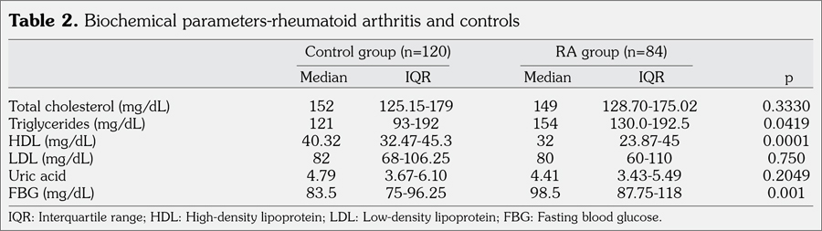 Biochemical parameters are demonstrated in Table 2. Median HDL level was significantly lower in RA group than in control group. Similarly, median triglyceride and fasting blood glucose levels were significantly higher in RA group than in control group. However, no difference was noted between both groups with respect to total cholesterol, serum uric acid, and LDL cholesterol levels.