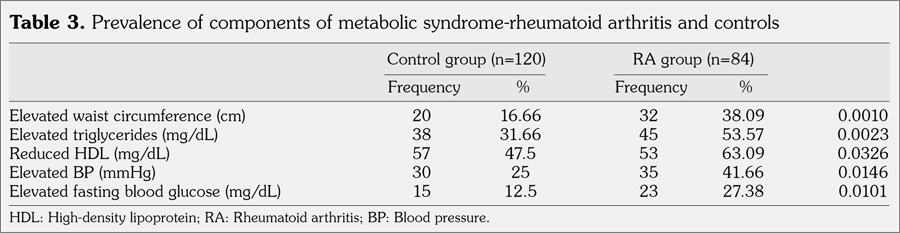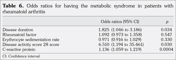 Results: Metabolic syndrome was found in 39.28% of RA group and 20% of control group according to National Cholesterol Education Program- Adult Treatment Panel III 2004 (p<0.005). MetS was most commonly detected in the 51 to 60 age group (65%). RA group was significantly more likely to have low high-density lipoprotein (63.09%), high triglyceride (53.57%), elevated blood pressure (41.66%) levels, and elevated waist circumference (38.09%). In RA group, disease activity score 28 (odds ratio: 6.51, confidence interval: 1.19-35.46 p=0.03), C-reactive protein (odds ratio: 1.13, confidence interval: 1.05-1.21 p<0.001), and duration of disease (odds ratio: 1.82, confidence interval: 1.04-3.18 p=0.03) remained independent predictors for presence of MetS in RA.