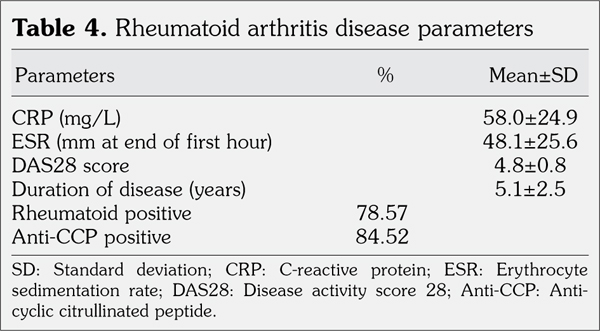 Characteristics of RA patients are summarized in Table 4. The mean duration of disease was 5.1±2.5 years. Of RA patients, 78.57% were rheumatoid factor positive and 84.52% were anti-cyclic citrullinated peptide positive. Mean CRP and ESR were 52.39±23.39 mg/dL and 43.3±24.82 mm at end of first hour, respectively. The mean DAS28 score was 4.8±0.84 and proportions of patients with mild (<3.2), moderate (3.2-5.1), and severe (>5.1) disease were 5.95%, 54.76%, and 39.28%, respectively.